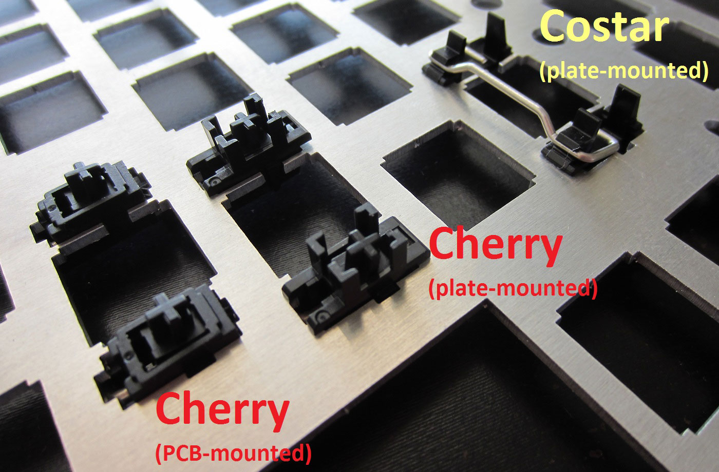 스테빌라이저 장착 구멍입니다. 대부분의 경우 체리식을 사용하므로 체리식을 선택하시면 됩니다. 기판에 장착하는 체리식 스테빌라이저는 보강판에 장착하는 형태보다 구멍이 작으므로 역시 체리식을 선택해 주시면 됩니다. Costar는 한국에서 흔히 마제식으로 불리는 형태입니다.