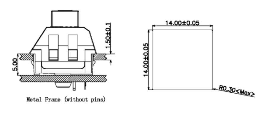 지지대 설계시 주의할 점은 보강판 상단에서 바닥면 까지 최소 9mm가 되도록 해야 한다는 것입니다. 스위치에서 나오는 다리 부분이 보강판 상단면에서 8.3(5.0+3.3)mm 이므로 보강판이 휘면서 바닥이 긁히지 않도록 하려면 10mm 이상을 확보하시길 권해드립니다. 또한 보강판 두께가 1.9T가 넘어갈 경우 스위치의 고정 돌기부분에 의한 탄력으로 스위치가 빠져나올 수 있으니 글루건이나 순간 접착제 등으로 고정하거나 돌기와 닿는 보강판 부분을 경사지게 갈아줄 필요가 있습니다. 또한 체리식 보강판 장착 스테빌을 사용할 경우 보강판 두께가 2T를 넘어가면 철심 부분과 간섭해서 키감에 악영향을 미치니 보강판 두께는 2T 이하로 만드실 것을 권합니다.